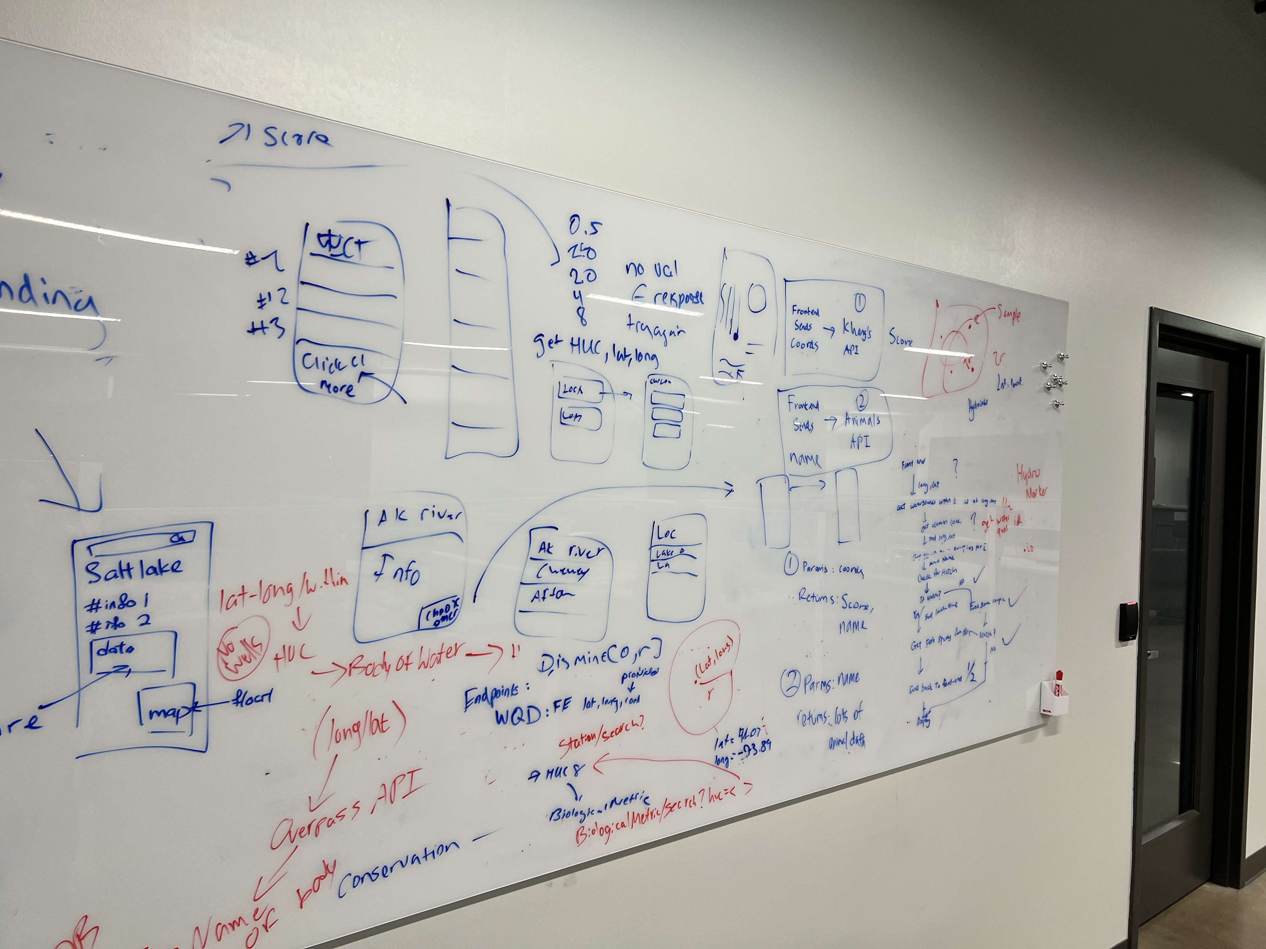 We listed the requirements then whiteboarded the solution. We decideded to separate the responsibilities into 5 main components. Frontend, WaterData: ListWaterBodies, WaterBodyData, AnimalData: ListAnimals, AnimalData.